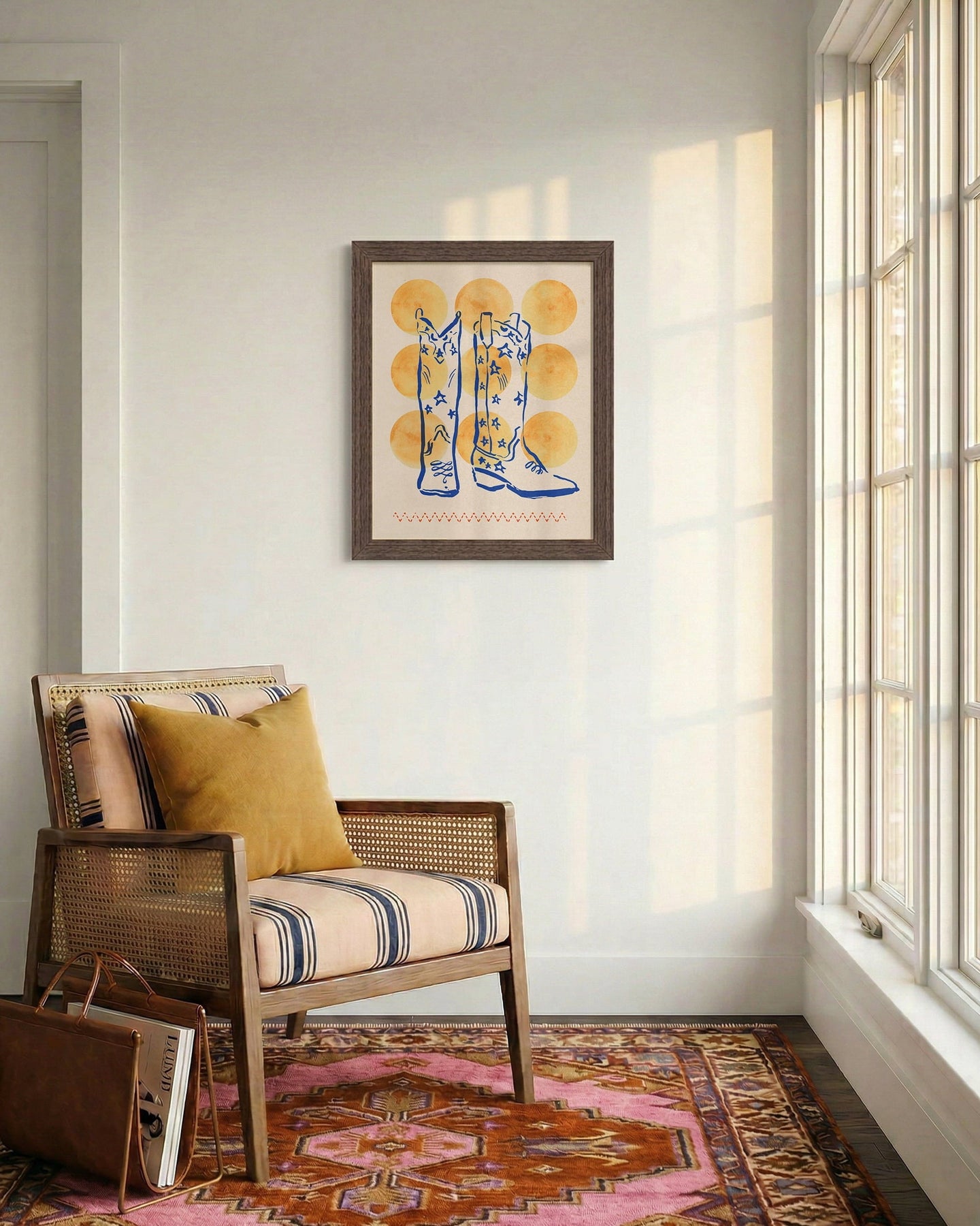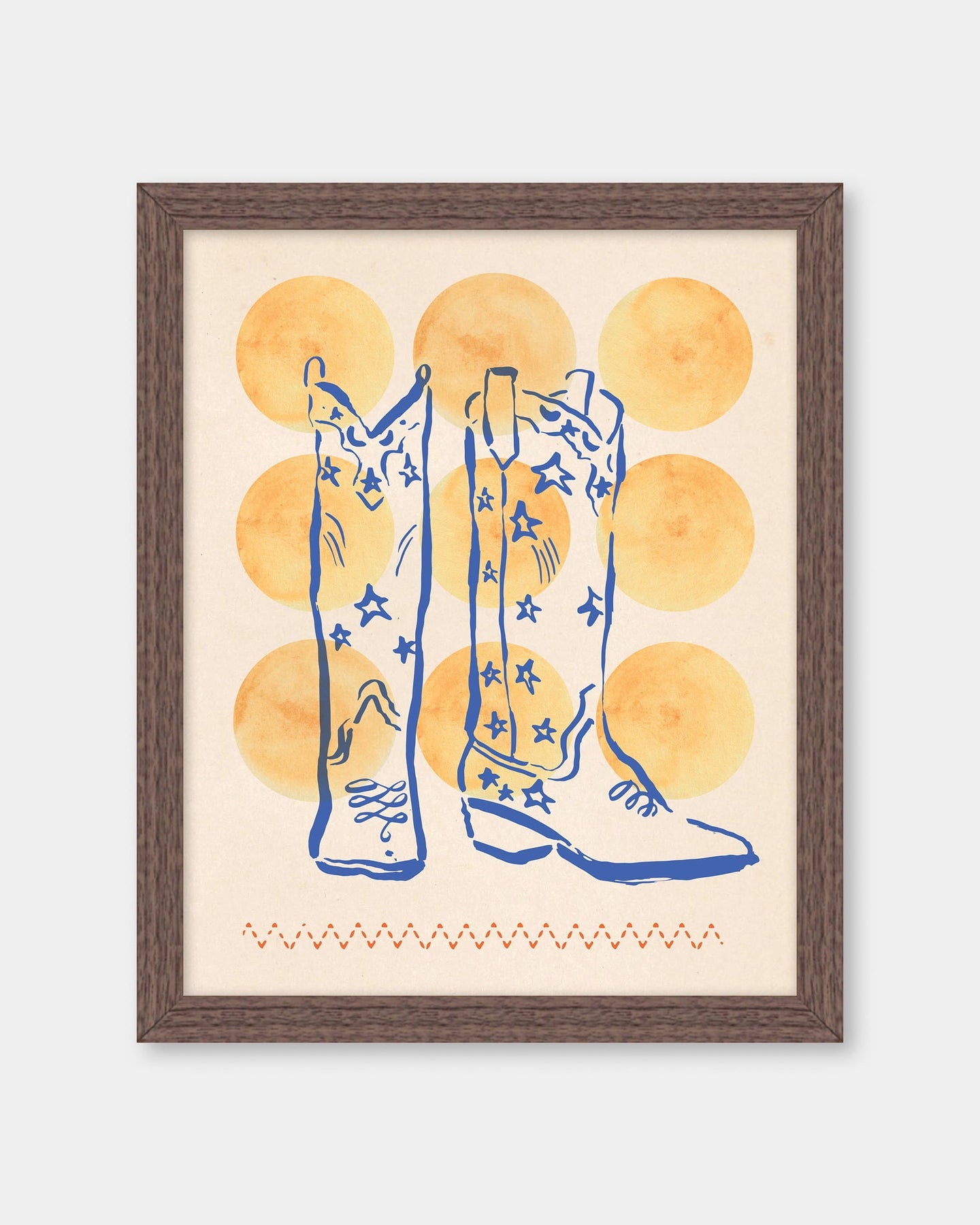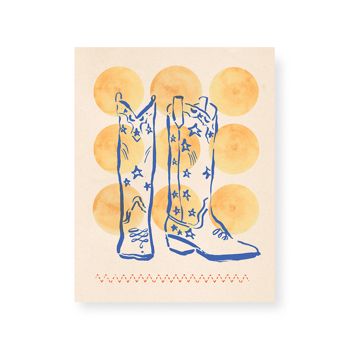 Classic cowboy boots, reimagined with a cosmic twist. Hand-drawn brushwork and soft watercolor details meet vintage paper textures for a starry take on Western iconography. Created exclusively for Katie Kime by artist Kelly Colchin.